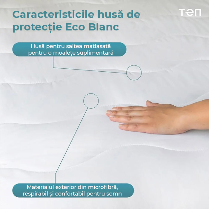 Husa pentru saltea ECO BLANC de la TEP cu umplutură hipoalergenică și microfibră protejează salteaua de murdărie și crește semnificativ confortul și moalețea locului de dormit.